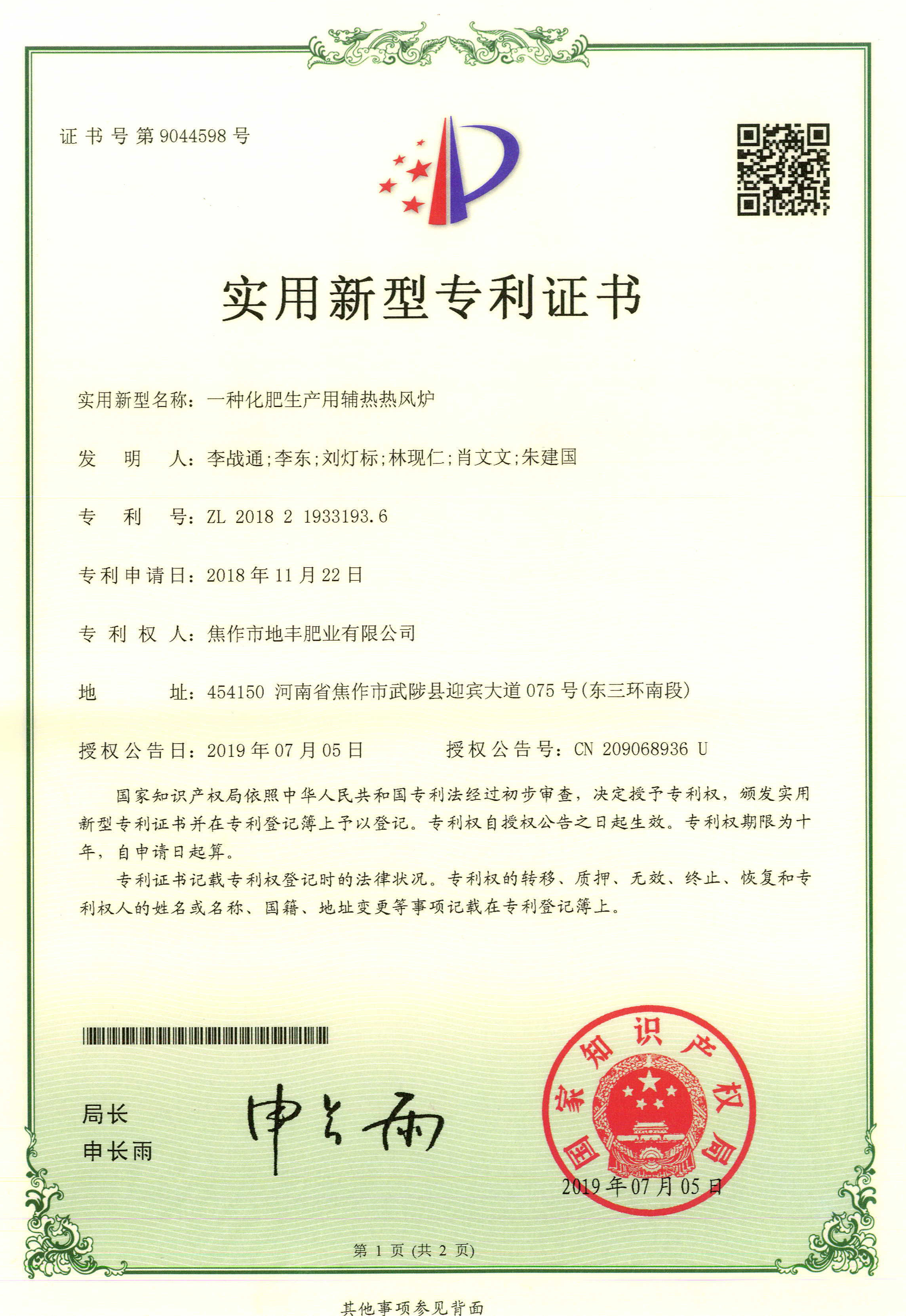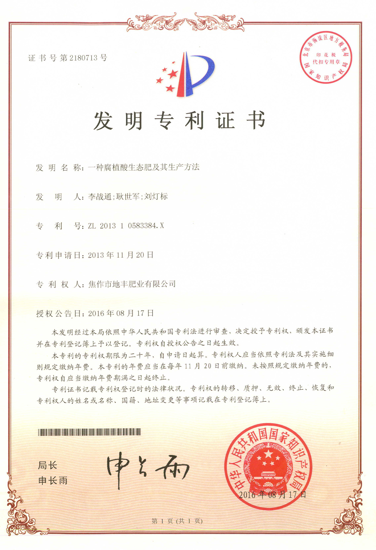 腐殖酸發明專利證書