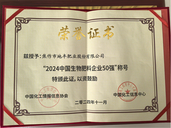 2024年11月29日,一條喜訊從鄭州傳來,在中國化肥企業100強評選活動暨中國化肥產業新質生產力論壇上,焦作市地豐肥業股份有限公司再次榮獲“中國化肥企業